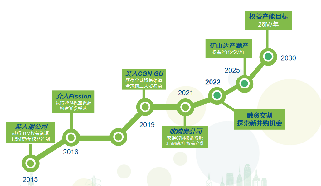◇ 2015年,收購哈薩克斯坦謝米茲拜伊鈾公司49%股權(quán),并獲得下轄兩座在運鈾礦49%的天然鈾產(chǎn)品包銷權(quán)。中廣核礦業(yè)成為一家主業(yè)清晰的鈾資源開發(fā)和貿(mào)易公司。 ◇ 2016年,收購加拿大上市公司Fission Uranium Corp 19.99%股權(quán),并獲得20%的天然鈾產(chǎn)品包銷權(quán)及額外的15%的包銷選擇權(quán)。中廣核礦業(yè)成功介入加拿大高品位鈾礦項目,成為Fission公司單一最大股東。 ◇ 2016年,中廣核礦業(yè)與哈薩克原子能工業(yè)股份有限公司簽署《鈾礦原則協(xié)議》及其補充協(xié)議,約定雙方就總資源量達(dá)4萬噸鈾的鈾礦山開展合作,其中公司未來總包銷量將不低于2萬噸鈾。 ◇ 2016年,復(fù)星集團認(rèn)購中廣核礦業(yè)9.99%股權(quán)。 ◇ 2019年,中廣核礦業(yè)完成對中廣核國際鈾產(chǎn)品銷售有限公司100%股權(quán)的收購。 ◇ 2021年,收購哈薩克斯坦奧爾塔雷克公司49%股權(quán),并獲得下轄兩座在運鈾礦49%的天然鈾產(chǎn)品包銷權(quán)。 ◇ 2022年,中廣核礦業(yè)引入混改基金為首11家投資人完成交割。